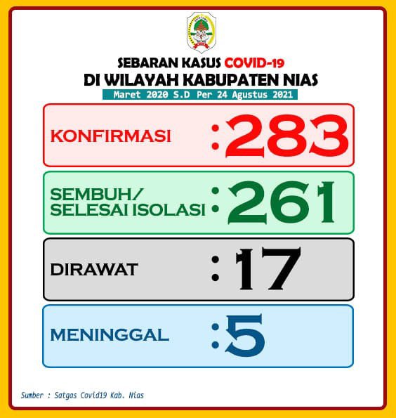 RADARINDONESIANEWS.COM, NIAS – Dinas Komunikasi dan Informatika Kabupaten Nias rilis penyebaran Covid-19 di wilayah Kabupaten Nias pada halaman website resmi www.niaskab.go.id tanggal, 24 Agustus 2021.