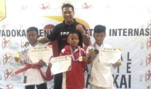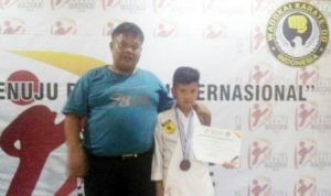 | Segoro Lintang P bersama para karateka saat menerima medali |