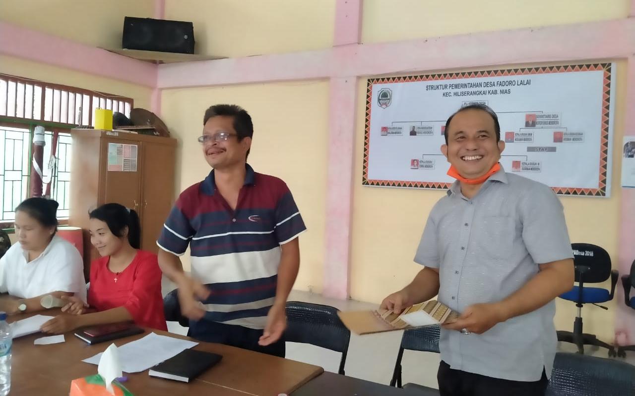 Tampak hadir dalam rapat, Pj. Kepala Desa Fadoro Lalai, unsur kelembagaan desa, unsur masyarakat desa, dan tenaga pendamping Kecamatan Hiliserangkai.