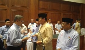 Koordinator Presidium API M.Izzul Muslimin yang juga mantan Ketua Umum PP Pemuda Muhammadiyah kemudian memberikan dukungan tertulis yang diterima langsung Prabowo di hadapan para hadirin dalam ruang Amphi Teater yang penuh oleh massa relawan itu.