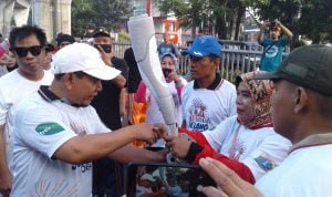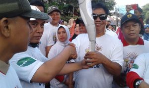 | Anggota DPRD DKI, Ahmad Yani saat menerima obor Asian Games dari Lurah Pela Mampang, Mariana, S.H.[Gofur/radarindonesianews.com] |