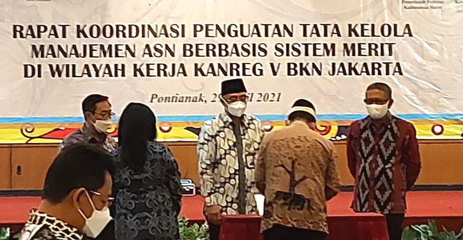 RADARINDONESIANEWS.COM, LAMTIM — Bupati Lampung Timur, M. Dawam Rahardjo mengikuti Rapat Koordinasi Pencanangan Penguatan Tata Kelola Manajemen ASN Berbasis Sistem Merit bersama Kepala Badan Kepegawaian Negara Republik Indonesia (BKN-RI) DR. Ir. Bima Haria Wibisana M,Si, dan Kepala Kantor Regional V BKN Jakarta, Julia Leli Kurniati, S.H.,M.H serta Ketua Komisi Aparatur Sipil Negara RI Prof Dr Agus Pramusinto, MDA Di Hotel Aston, Pontianak, Kamis (29/April/2021).
