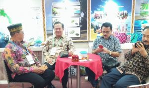 Bupati Nias, Sokhiatulo Laoli (dua dari kiri) tampak sedang berbincang kepada pengunjung stand Kabupaten Nias.[Albert/radarindonesianews.com]