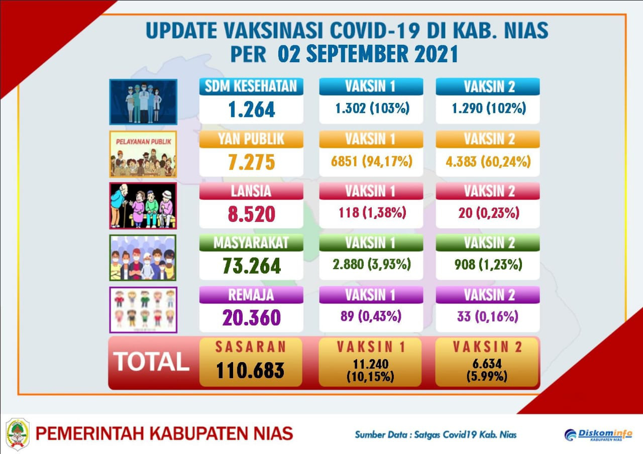 Target sasaran Vaksin Covid-19 secara keseluruhan untuk masyarakat Kabupaten Nias 110.683 orang dengan keterangan sebagai berikut : Tenaga kesehatan 1.264; Pelayan publik 7.275; Lansia 8.520; Masyarakat 73.264; dan Remaja 20.360.