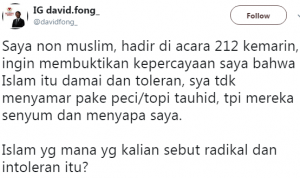 “Saya non muslim, hadir di acara 212 kemarin, ingin membuktikan kepercayaan saya bahwa Islam itu damai dan toleran, sya tdk menyamar pake peci/topi tauhid, tpi mereka senyum dan menyapa saya. Islam yg mana yg kalian sebut radikal dan intoleran itu?” Tulis David Fong di akun IG miliknya, Senin (3/12/2018).