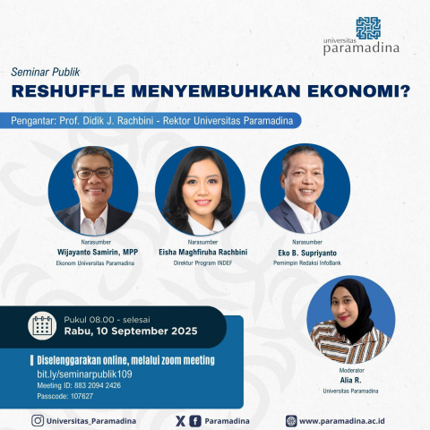 Diskusi yang dibuka Rektor Paramadina, Prof Didik J. Rachbini, menghadirkan tiga narasumber: ekonom Paramadina Wijayanto Samirin, Direktur Program INDEF Eisha Maghfiruha Rachbini, dan Pemimpin Redaksi Infobank Eko B. Supriyanto. Acara dipandu moderator Alia R. dari Paramadina.