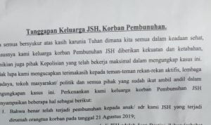 Kita semua bersyukur atas kasih karunia Tuhan dimana kita semua dalam keadaan sehat, khususnya kami keluarga korban Pembunuhan JSH diberikan kekuatan dan ketabahan, demikian juga pihak Kepolisian yang telah bekerja maksimal dalam mengungkap kasus ini. Tidak lupa kami mengucapkan terimakasih kepada teman-teman rekan-rekan aktifis, lembaga swadaya, tokoh masyarakat/ politik dan semua pihak yang sudah ikut ambil andil dalam pengungkapan kasus ini. Perkenankan kami keluarga korban Pembunuhan JSH menyampaikan beberapa hal sebagai berikut: