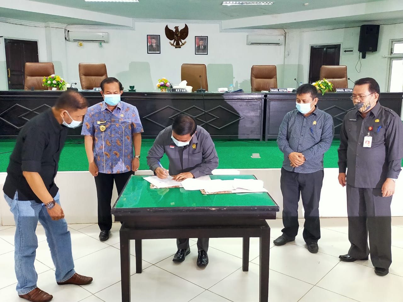 Bupati Nias usai menyampaikan pendapat akhirnya dilanjutkan dengan penandatanganan persetujuan bersama antara Bupati Nias dengan DPRD Kabupaten Nias.