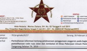 RADARINDONESIANEWS.COM, TANGSEL – Lembaga Perkumpulan Gerakan Moral Anti Kriminalitas (GMAKS) pada Tanggal 26 Febuari 2017 lalu mengirimkan surat resmi permohonan informasi yang kedua kepada Dinas Pekerjaan Umum (PU) Kota Tangerang Selatan (Tangsel) yang hingga kini belum mendapatkan balasan tentang informasi tersebut.
