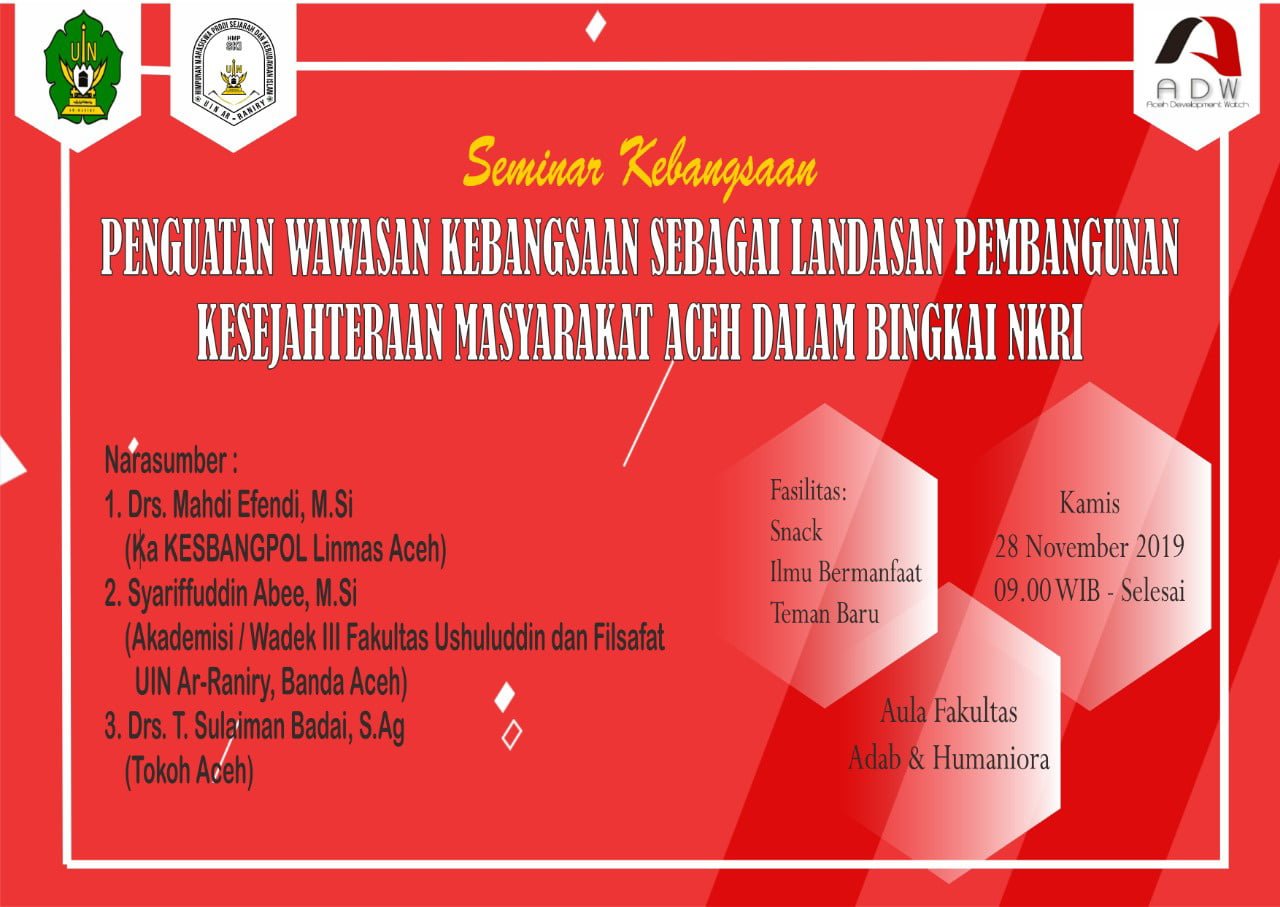 RADARINDONESIANEWS.COM, ACEH – Himpunan Mahasiswa Prodi Sejarah Kebudayaan Islam (HMP SKI) Fakultas Adab dan Humaniora UIN Ar-Raniry Banda Aceh bekerjasama dengan Aceh Development Wacht (ADW) akan menggelar diskusi publik dengan tema Penguatan Wawasan Kebangsaan sebagai Landasan Pembangunan Kesejahteraan Masyarakat Aceh dalam Bingkai NKRI.