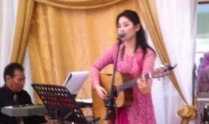 | Bella Bonita dwngan sebuah guitar dalam sebuah penampilan.[Alex/radarindonesianews.com] |
