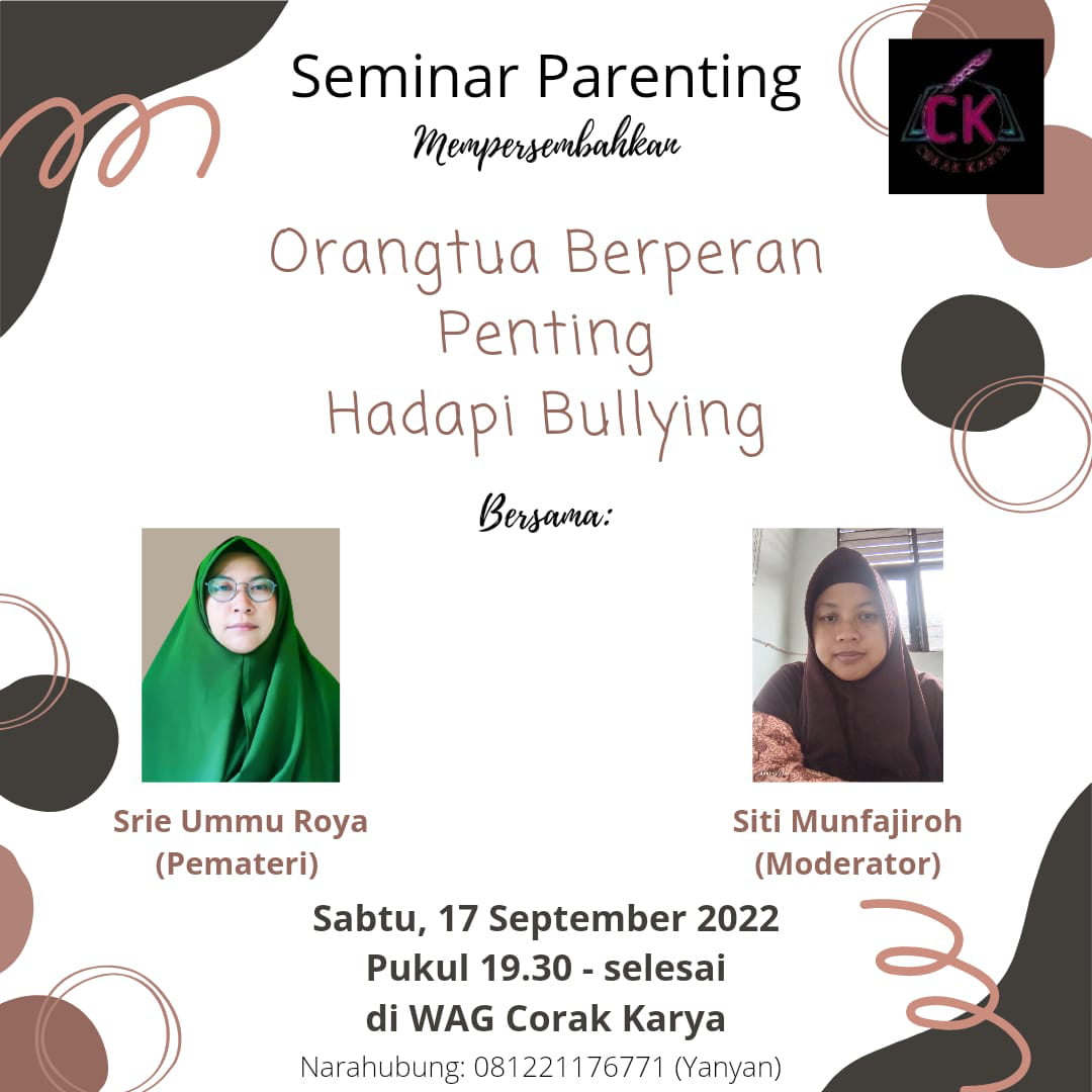 RADARINDONESIA.NEWS.COM–Komunitas Corak Karya kembali mengadakan seminar parenting bertajuk “Orangtua Berperan Penting Hadapi Bullying”, pada Sabtu (18/9/2022).