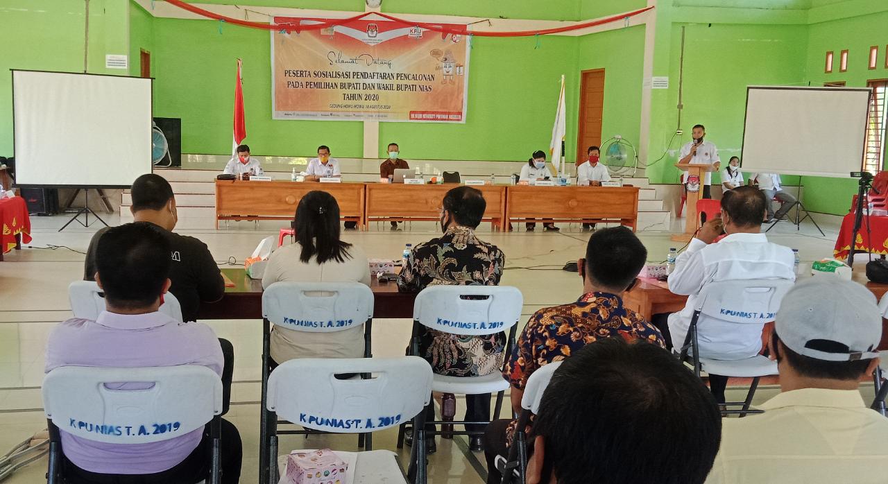 RADARINDONESIANEWS.COM, NIAS – Komisi Pemilihan Umum (KPU) Kabupaten Nias sosialisasikan pendaftaran pencalonan kepala daerah pada pemilihan Bupati dan Wakil Bupati Nias tahun 2020, Senin (10/8), bertempat di Gedung Serba Guna Howu-Howu Lasara Idanoi, Kecamatan Gido, Kabupaten Nias.