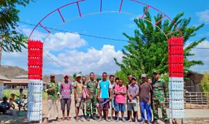“Memanfaatkan botol bekas air mineral, ditambah dengan bahan-bahan yang berasal dari alam, Satgas mengajak warga Dusun Motabenar  membangun sebuah gapura pintu masuk dusun tersebut,” ujarnya.