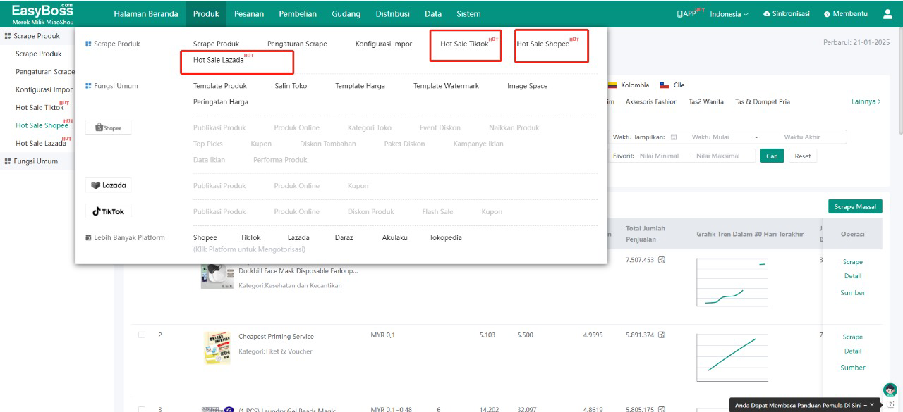 Buka menu Produk → Hot Sale Shopee/TikTok/Lazada