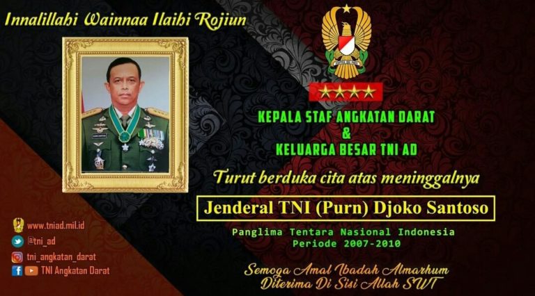 Sebagai bentuk penghormatan dan rasa duka cita yang mendalam atas kepergian Almarhum Jenderal TNI (Purn) Djoko Santoso, seluruh satuan jajaran TNI/TNI Angkatan Darat mulai hari ini mengibarkan bendera setengah tiang,” pungkas Nefra.