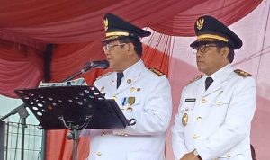 Bupati dan Wakil Bupati Nias saat menyampaikan sambutan di pncak peringatan HUT Kabupaten Nias ke-158. [Albert/radarindonesianews.com]