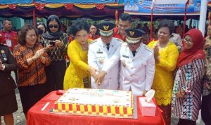 Bupati dan Wakil Bupati Nias potong kue di HUT Kab Nias ke -148.[Albert/radarindonesianews.com]