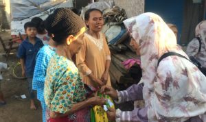 | Dra. Umi Salamah, Kepala Sekolah STP-SD Khairu Ummah saat menyerahkan bantuan paket sembako kepada masyarakat Rancabereum |