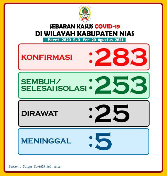 RADARINDONESIANEWS.COM, NIAS – Mengalami penurunan jumlah pasien terkonfirmasi Covid-19, kini jumlah pasien yang di isolasi di wilayah Kabupaten Nias tinggal 25 orang.