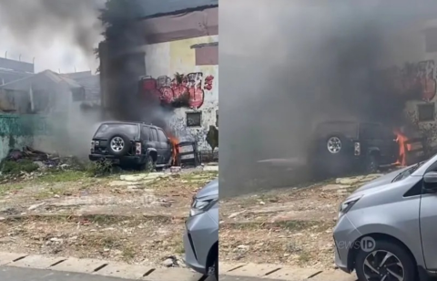 Viral video di media sosial Instagram @jakartanews_id yang memperlihatkan mobil di sudut halaman terbakar dan dikelilingi warga yang menonton.[]