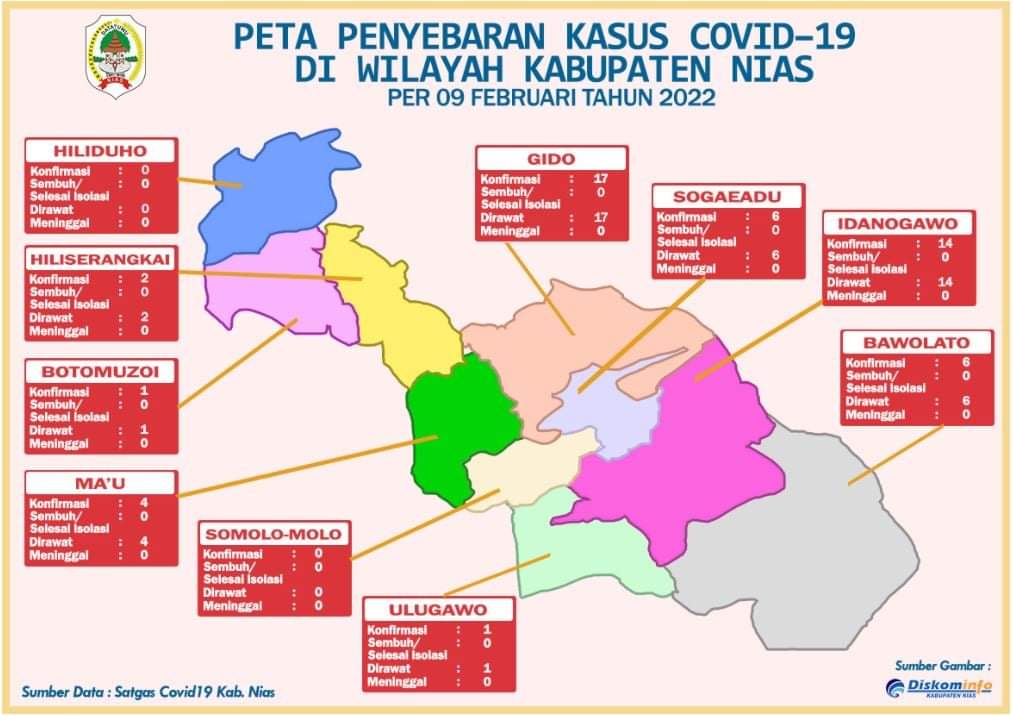 Pada informasi data penyebaran Covid-19 tersebut di petakan sesuai Kecamatan masing-masing yang ada di wilayah Kabupaten Nias, berikut datanya.