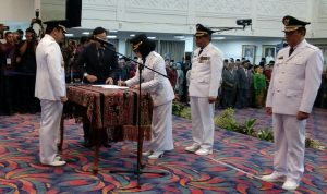 Gubernur Lampung M. Ridho Ficardo melantik dan mengambil sumpah Bupati Tanggamus Hj. Dewi Handajani dan Wakil Bupati Tanggamus Hi. AM Syafi’i masa bakti 2018 – 2023 di Balai Keratun Kantor Gubernur Lampung.[Iyan/radarindonesianews.com]