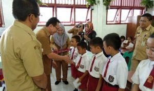 Sekda Nias saat menyerahkan beasiswa kepada siswa/i berprestasi tingkat SD.[Albert/radarindonesianews.com]