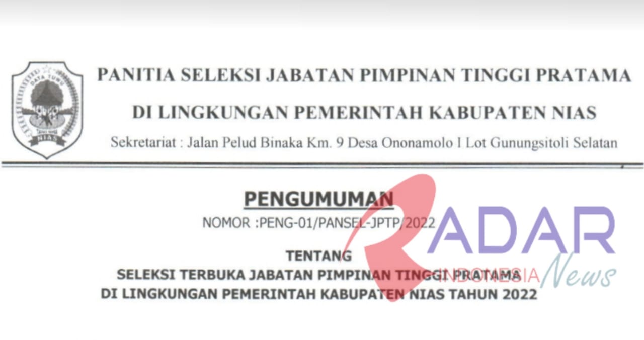 RADARINDONESIANEWS.COM, NIAS – Pemerintah Kabupaten Nias melalui Panitia Seleksi Jabatan Pimpinan Tinggi Pratama di Lingkungan Pemerintah Kabupaten Nias Tahun 2022 mengeluarkan pengumuman dengan Nomor : PENG-01/PANSEL-JPTP/2022.