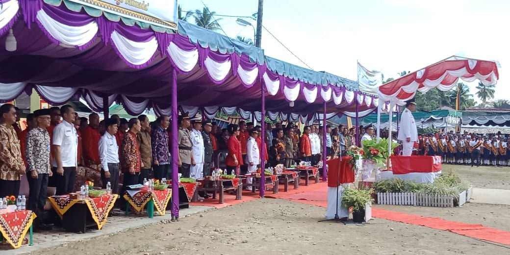 Bupati Nias sebagai pimpinan upacara membacakan butir Pancasila yang disahut oleh peserta upacara.