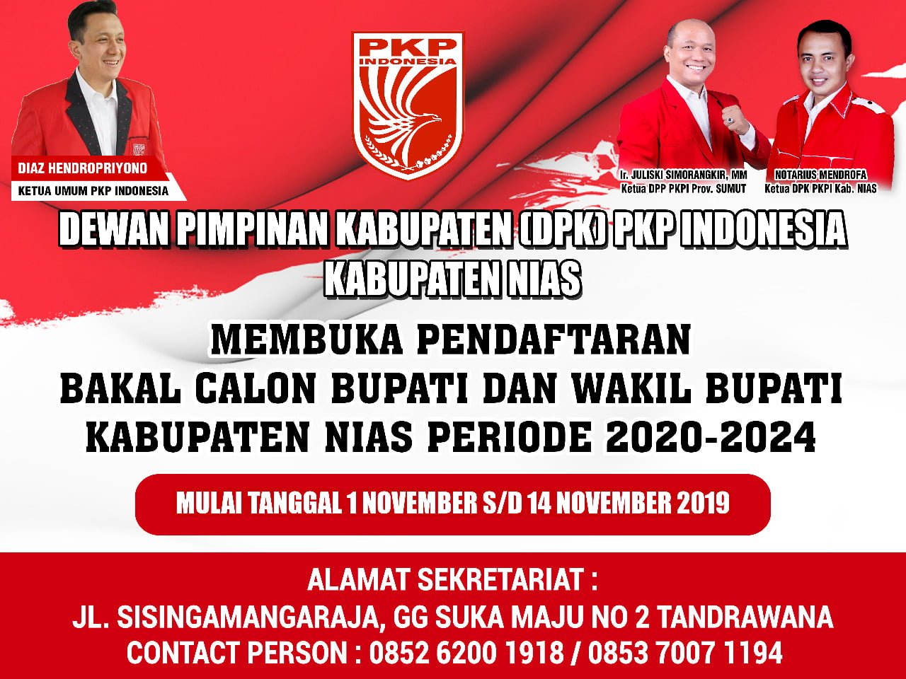 RADARINDONESIANEWS.COM, NIAS – Partai Keadilan dan Persatuan Indonesia (PKPI) Kabupaten Nias resmi membuka pendaftaran bagi calon kepala daerah di Pemilihan Kepala Daerah (Pilkada) serentak 2020 Kabupaten Nias.