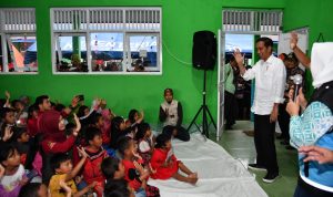 “Anak-anak tetap belajar kan? Dengan Kak Seto belajar? Mau? Belajar apa? Main sulap? Terus apa lagi? Bernyanyi, iya terus apa lagi? Senam biar sehat, benar, terus? Matematika, berhitung juga? Pintar semua ini. Saya beri buku dibagi, tiga-tiga, empat-empat ya,” ucap Presiden.