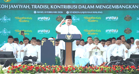 Apresiasi tersebut disampaikan Prabowo saat memberikan sambutan pada acara Mujahadah Kubra Satu Abad Nahdlatul Ulama di Stadion Gajayana, Kota Malang, Jawa Timur, Ahad (7/2/2026). Ratusan ribu jamaah NU dari berbagai daerah tampak memadati stadion untuk mengikuti rangkaian doa dan mujahadah.
