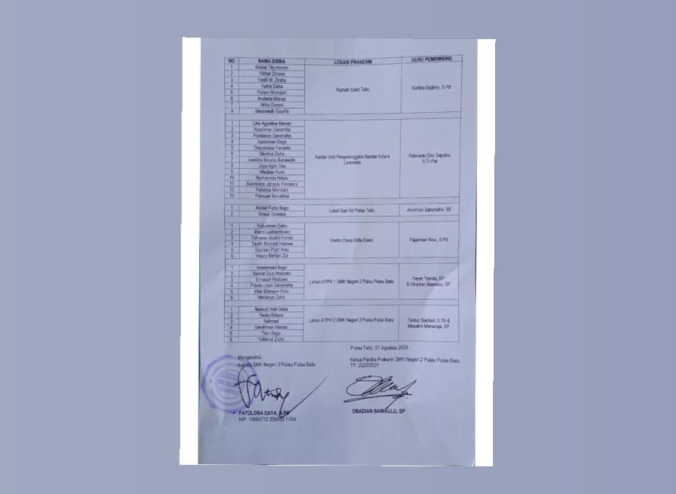 “Pada tanggal 1 Agustus semua siswa SMKN 2 Pulau Pulau Batu khusus kelas XII (dua belas-red) mengikuti pembekalan pemberangkatan siswa prakerin di lokasi praktek masing masing. Artinya semua siswa telah mendapatkan persetujuan pihak sekolah untuk mengikuti Prakerin,” jelas Fatolosa Daya menjawab pertanyaan awak media terkait alasan tidak diperkenankan salah seorang siswanya untuk prakerin.