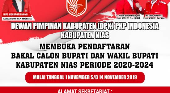 Berita Kepulauan Nias PKPI Kabupaten Nias Buka Pendaftaran Cakada, Berikut Informasinya Daerah, Kep. Nias|October 31, 2019by Admin RIN RADARINDONESIANEWS.COM, NIAS – Partai Keadilan dan Persatuan Indonesia (PKPI) Kabupaten Nias resmi