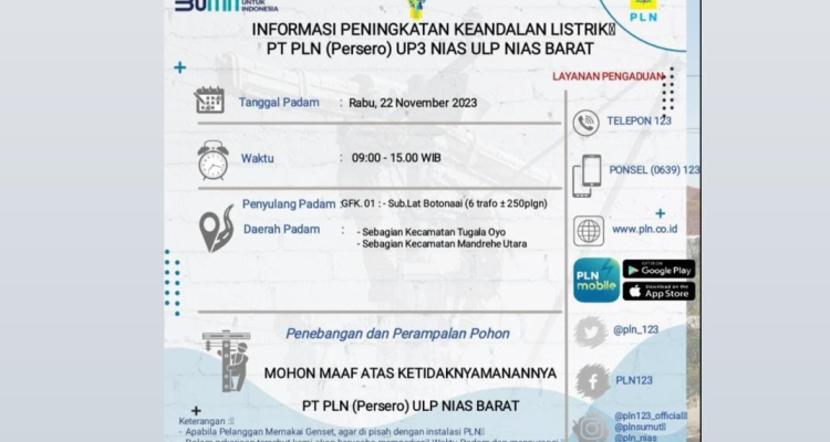 PLN Lakukan Pemeliharaan Terencana, ini Wilayah Padam di Nias Barat Daerah, Kep. Nias|November 22, 2023by radarnews RADARINDONESIANEWS.COM, NIAS BARAT – Untuk tetap menjaga keandalan listrik, PLN Unit