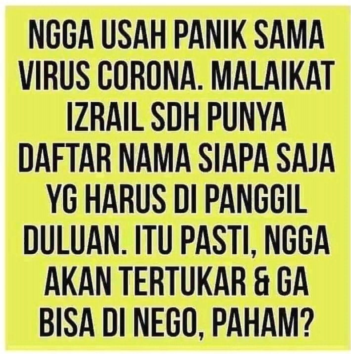 “Gausah panik sama virus corona, malaikat Izrail sudah punya daftar nama siapa saja yang harus dipanggil duluan. Itu pasti, gak akan tertukar dan gak bisa dinego. Paham?”