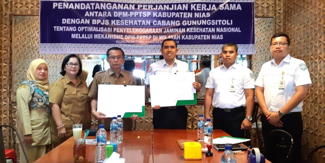“Peraturan Pemerintah Nomor 85 Tahun 2013 tetang Tata Cara Hubungan Antar Lembaga BPJS Kesehatan, mengamanatkan agar BPJS Kesehatan menjalin kerjasama dengan pemerintah pusat dan pemerintah daerah dalam menyelenggarakan program jaminan kesehatan. Kami menyadari kesuksesan dan keberlangsungan program JKN-KIS, hanya akan terwujud jika terjalin kerja sama yang kuat dengan para pihak. Untuk itulah BPJS Kesehatan Cabang Gunungsitoli menjalin kerjasama dengan DPM-PPTSP Kabupaten Nias, yang tujuannya untuk memastikan kepatuhan badan usaha dalam era JKN-KIS,” pungkasnya.