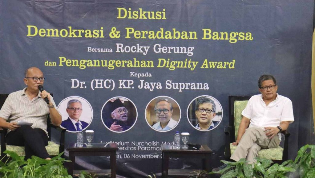 Demikian disampaikan Rocky Gerung dalam Diskusi Demokrasi dan Peradaban dan Penganugerahan Dignity Award yang diselenggarakan atas kerjasama Institut Peradaban dan Universitas Paramadina di Auditorium Nurcholish Madjid Universitas Paramadina, Senin (6/11/2023).