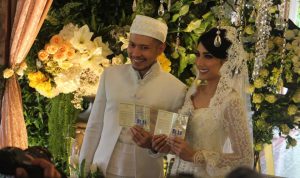 | Raden Muhamad Soedjaon dan Tyas Mirasih usai aqad nikah.[Gofur/radarindonesianews.com] |