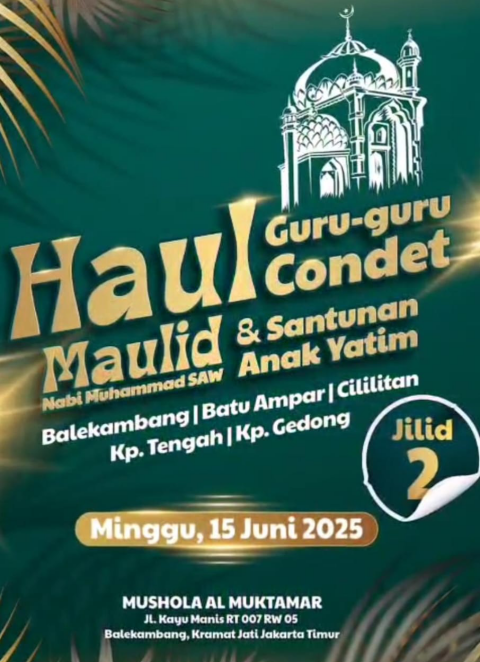 RADARINDONESIANEWS.COM, JAKARTA – Dengan semangat kebersamaan dan penghormatan terhadap para guru serta kecintaan kepada Rasulullah SAW, masyarakat Condet akan menggelar acara Haul Guru-Guru Condet, sekaligus Maulid Nabi Muhammad SAW dan Santunan Anak Yatim.