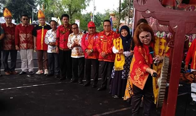 Sebelum mengakhiri sambutan Gubernur, Ria Nofida Telaumbanua membuka dengan resmi event Ya’ahowu Nias Festival yang ditandai dengan pemukulan gong. (Albert)